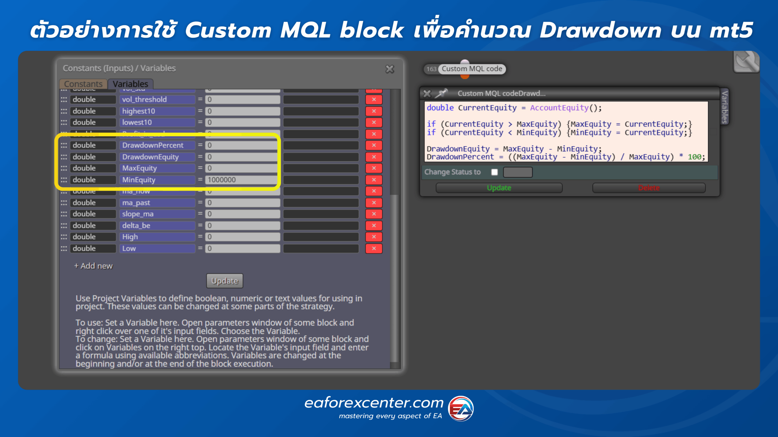 จากคำถามของเพื่อนๆ ในกลุ่ม fxDreema Academy ครับว่า ต้องการโชว์ Drawdown บน mt5 แต่ฟังก์ชันของ fxDreema ดันไม่มีมาให้แบบของ mt4.. จะต้องแก้ไขยังไง?? คำถามนี้ดีมากๆ ครับ เราจะขอนำเสนอการใช้ Custom mql block โดยให้ใส่ Code ดังต่อไปนี้ครับ