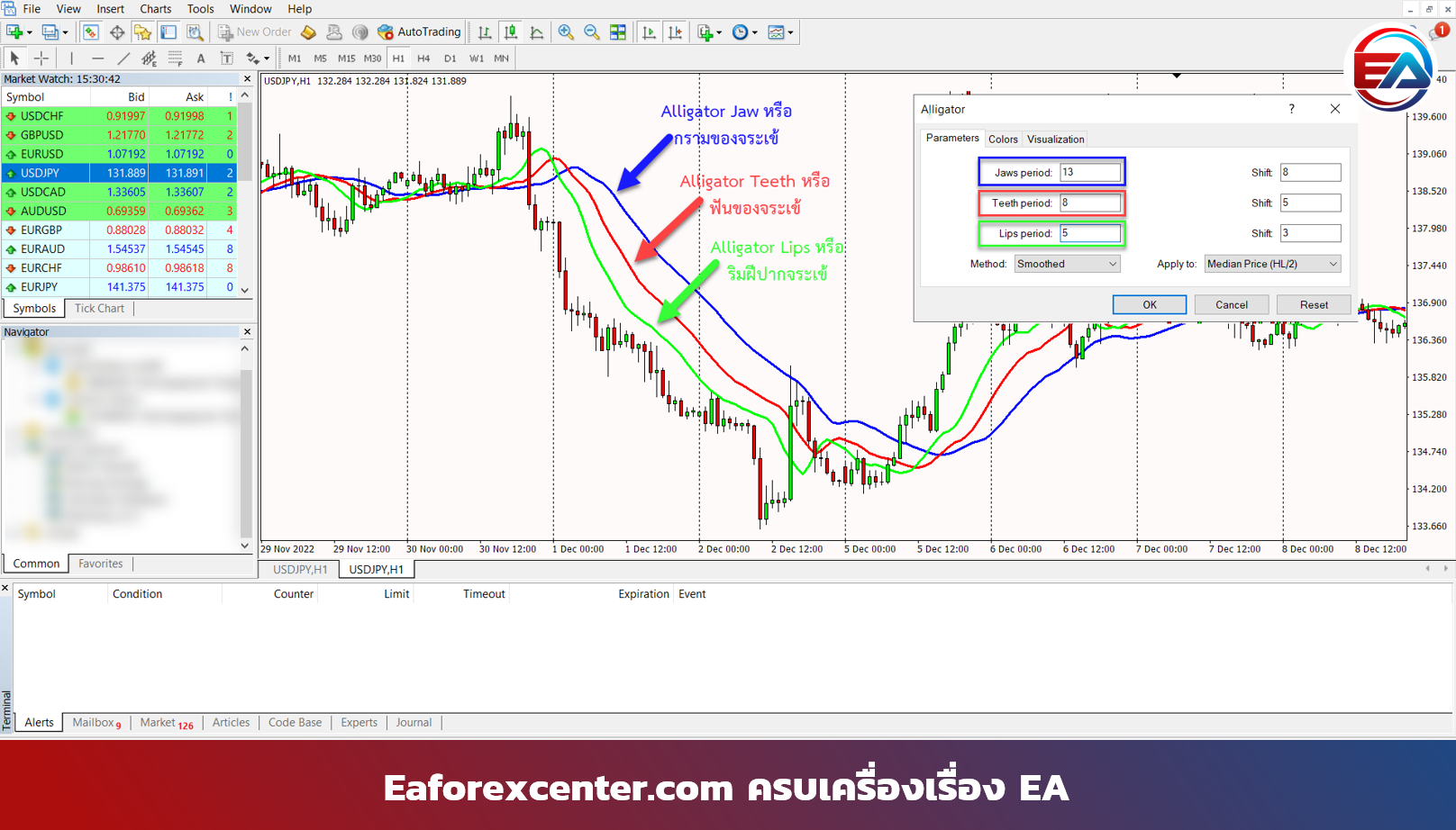 The Alligator Indicator concept is based on the alligator’s anatomy, comparing different parts of the Alligator such as the jaw (Jaw), teeth (Teeth), and lips (Lips) as follows: