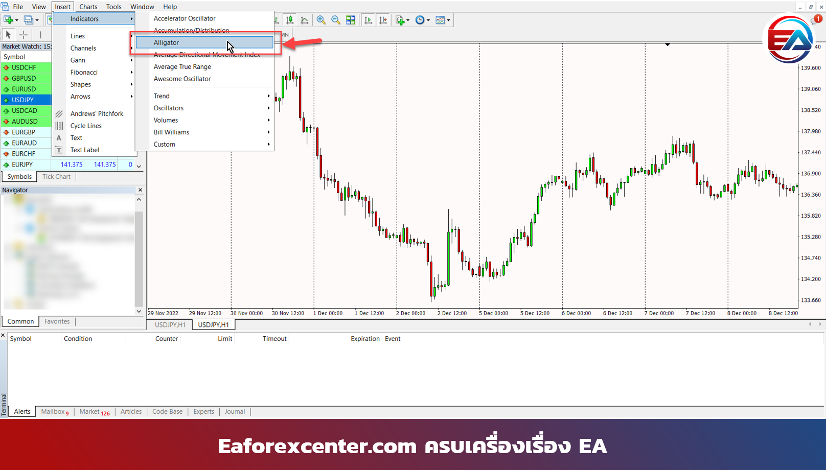The Alligator indicator is relatively easy to use compared to other indicators. It’s similar to a 3-line EMA system and comes built-in with Meta Trader 4 (MT4).