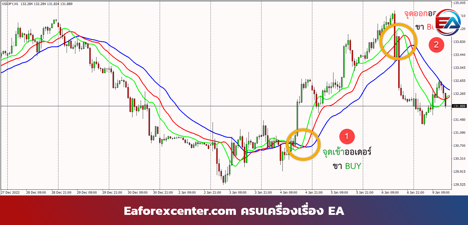 For Sell orders, it’s the opposite of Buy orders. Watch the three lines – when the green line crosses below both the red and blue lines as shown at point 1, enter a Sell order. Exit when the green line crosses back as shown at point 2.