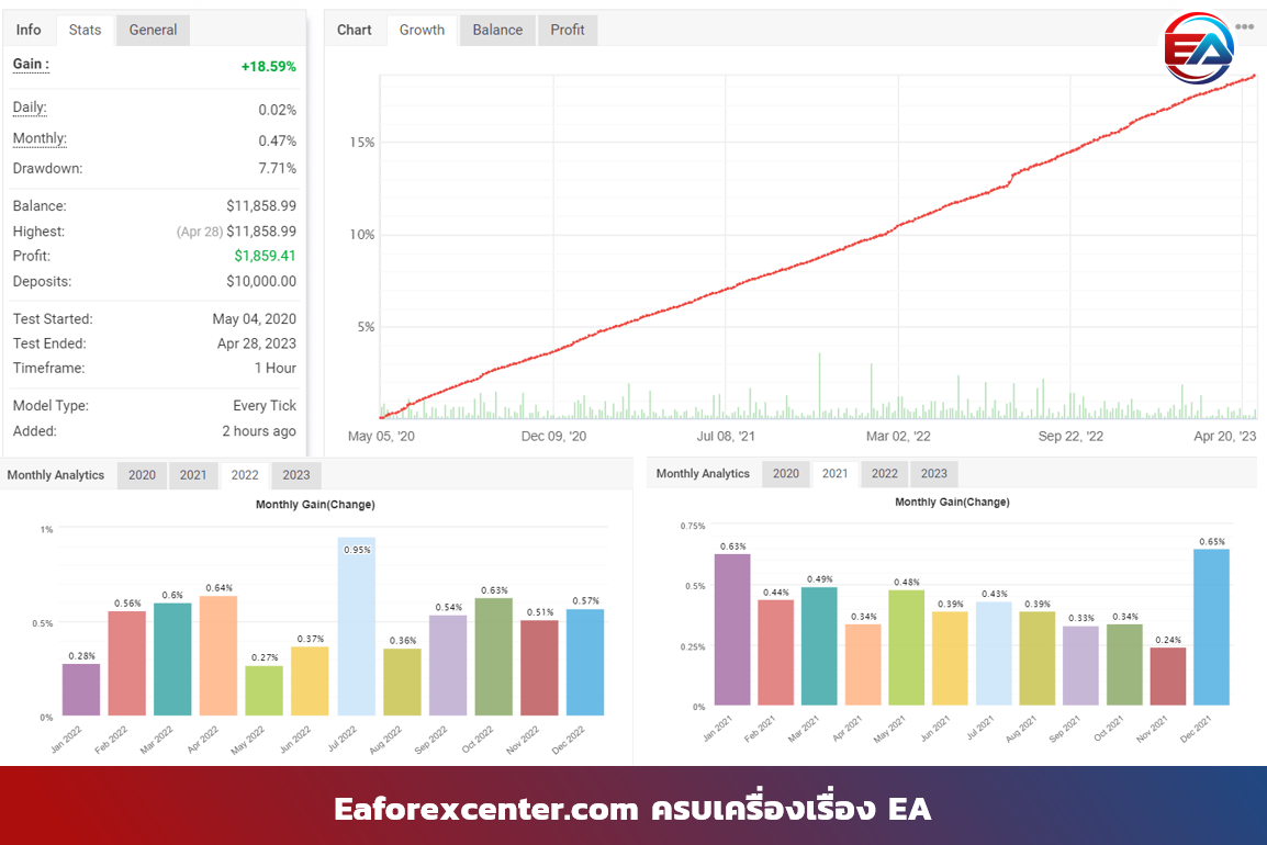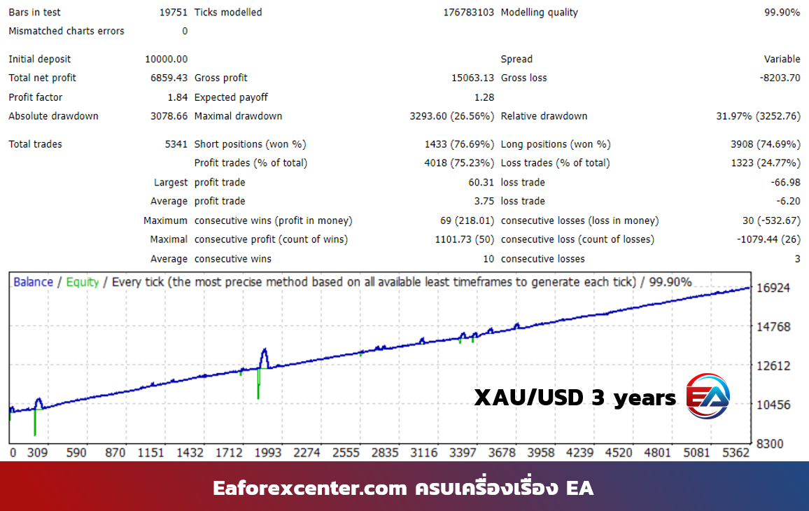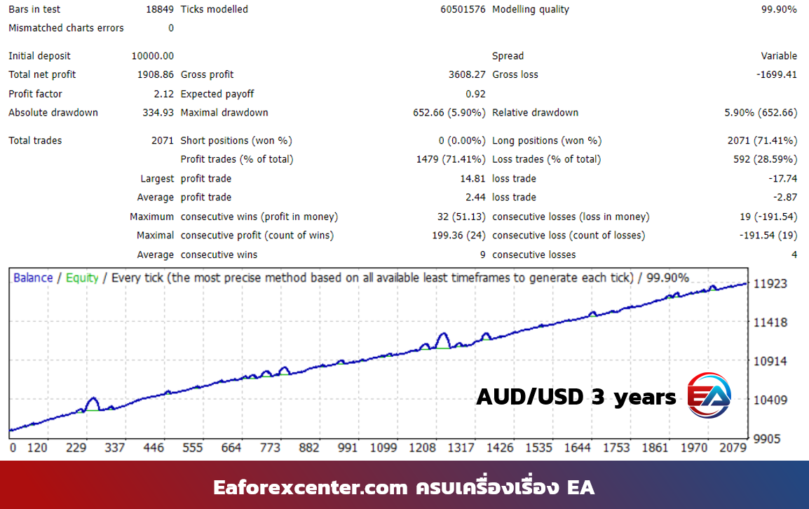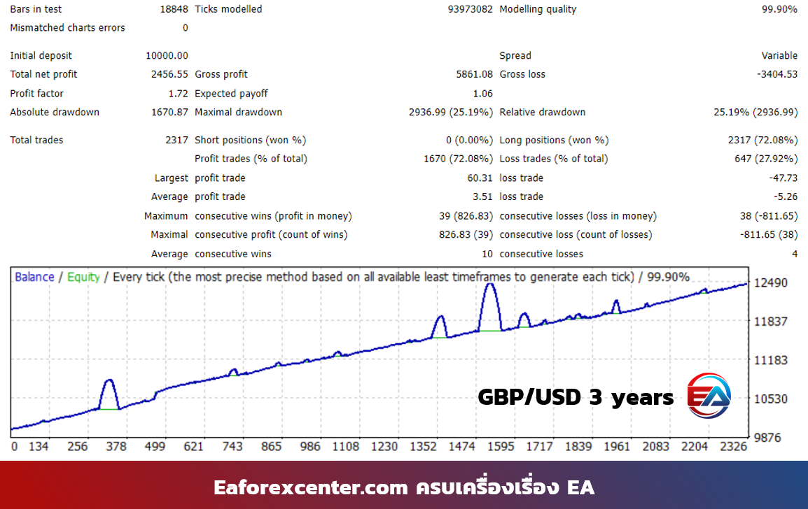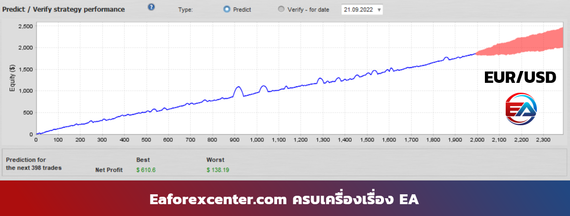When looking at the future prediction section after 3 years of backtesting, we found that in the worst-case scenario, the EA still generates small profits, which might still be considered not worthwhile if continued. You might consider running more than 1 currency pair but not more than 3 currency pairs if capital equals 10,000 USD