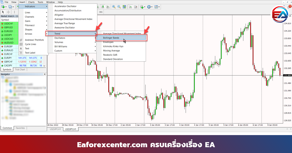 The working principle of Bollinger bands indicator is quite simple, generally similar to using support and resistance levels. First, let’s see how to open Bollinger bands indicator in MT4. Notice in the image below that the indicator is in the Trend category