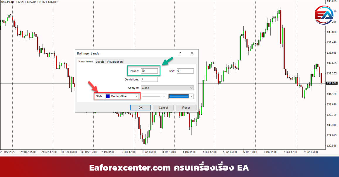 Once settings are complete, you’ll see 3 lines appear as shown below, consisting of Upper Band, Middle Band, and Lower Band, calculated according to the formulas mentioned above