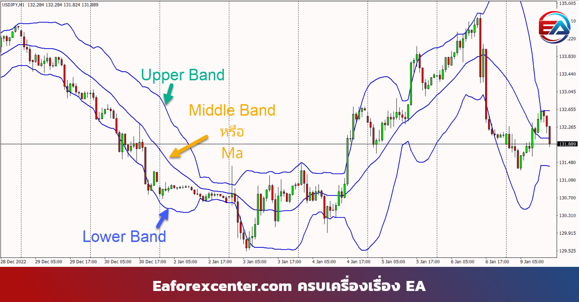 Bollinger Band is a tool used to analyze market volatility based on Moving Average Indicator that works with calculations using Standard Deviation (SD) to measure price volatility. It consists of three lines: Upper Band, Middle Band, and Lower Band, which can be used for buying or selling orders. It’s considered a truly effective indicator