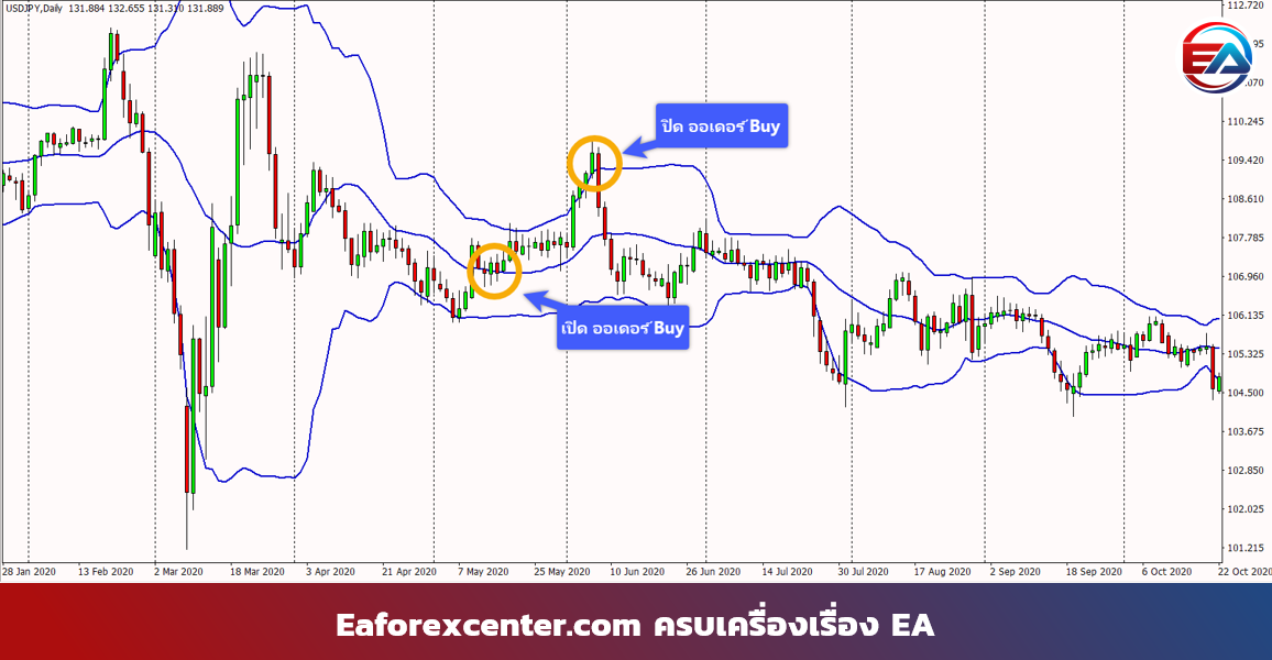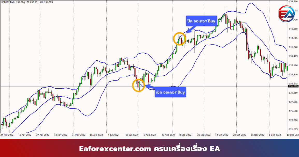 At the same time, we can make profits by starting from the Upper Band or Lower Band. Look at the image below – when the chart comes down to hit or break through the Lower Band, open a Buy order because there’s a high chance the chart will reverse upward. Then wait to close the order when the chart goes up to hit the Upper Band