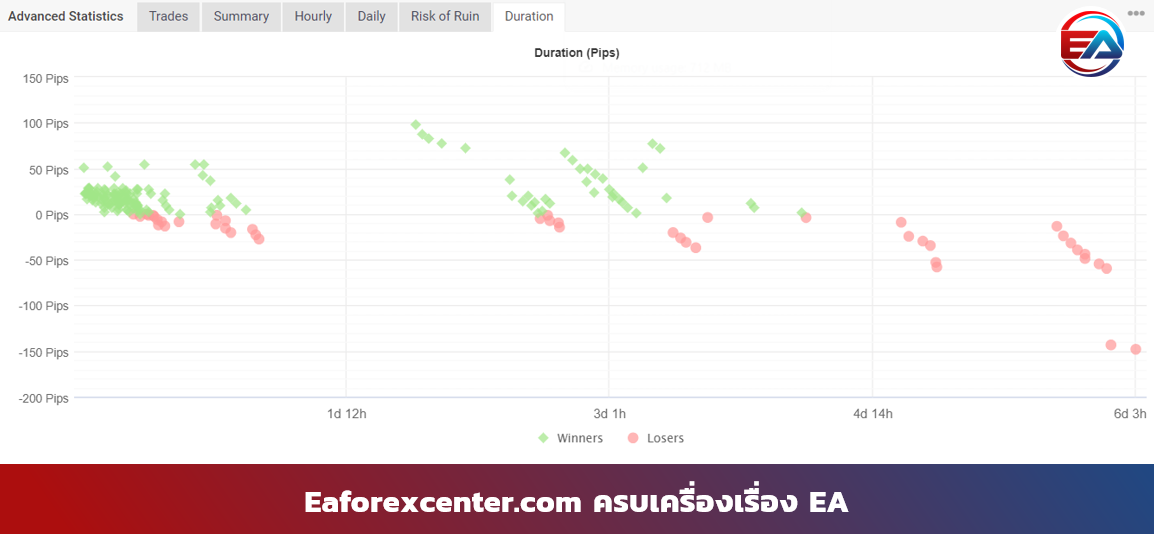 Looking further down at the Duration section, we found that Blue Beetle holds orders for a maximum of about 6 days, and we can observe that if the EA keeps positions open for more than 4 days, there’s no chance of profit. Therefore, we can cut losses ourselves if we assess the situation and determine there’s unlikely to be a reversal